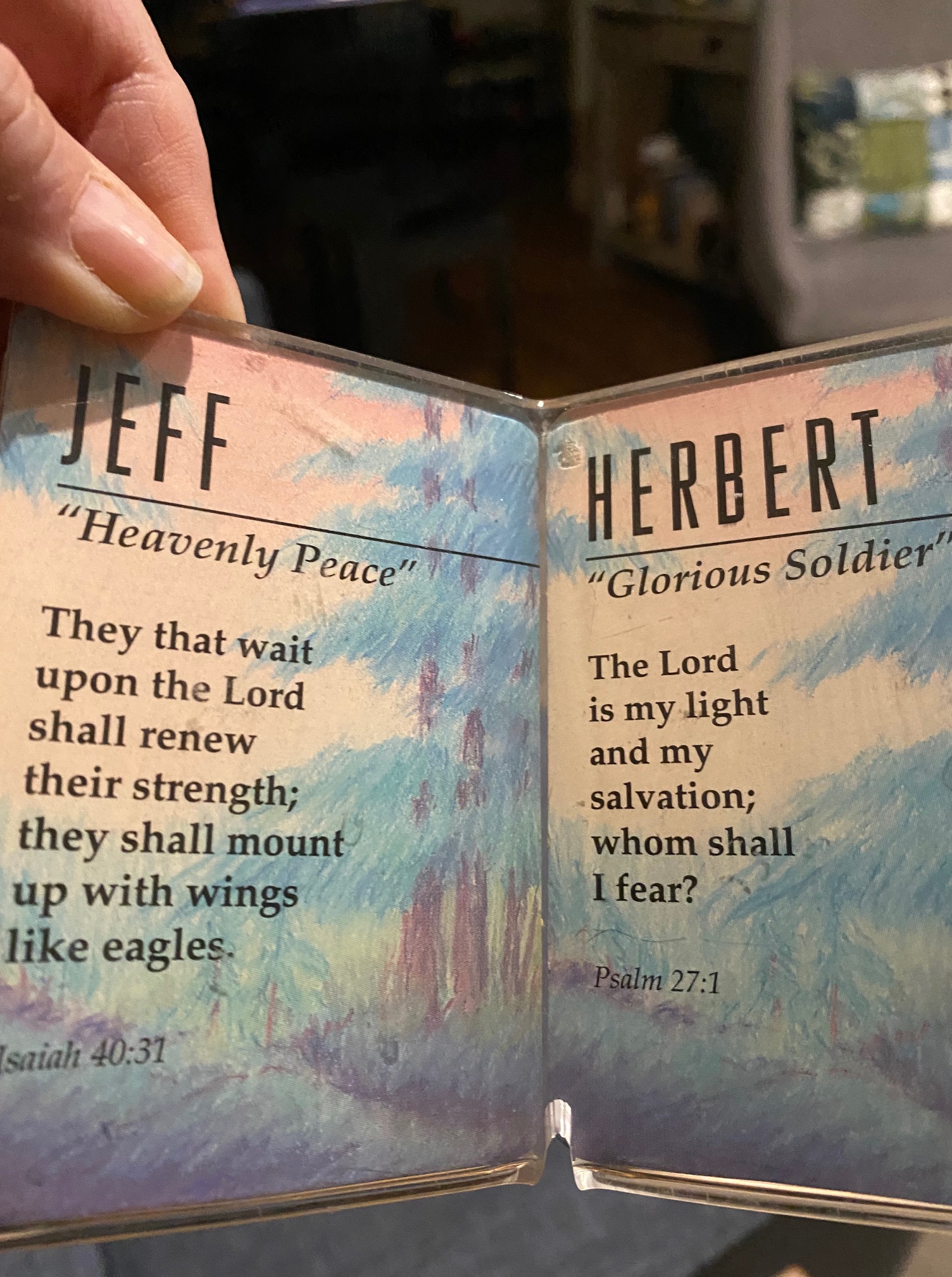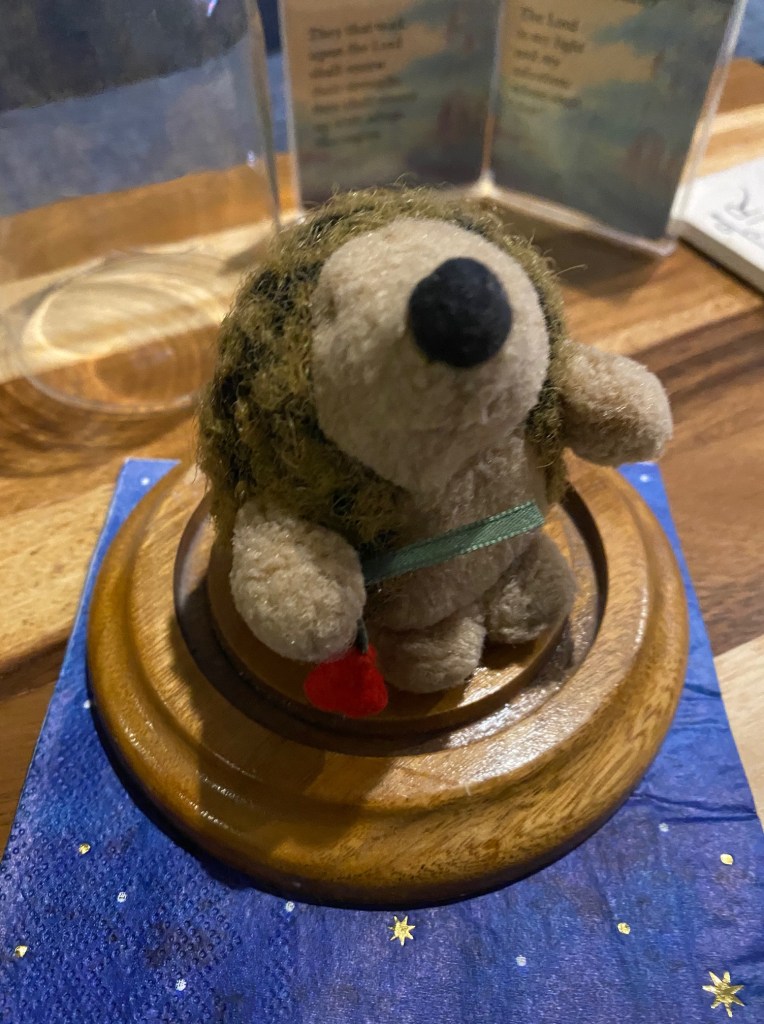 One of Jeff’s favorite companions during his year with cancer was Herbert, a tiny, stuffed, hedgehog that fit nicely in the palm of his hand. Herbert had his own storyline, along with his own little suitcase, complete with a wardrobe for his exploits. At one point, during a visit to the cancer clinic, Herbert flatlined and had to be resuscitated by Jeff, who used his fingertips as defibrillator paddles (Clear!). His alter ego, evidently, was a cyborg (or is he an android?). Now retired, Herbert lives under a glass dome on the West Coast.